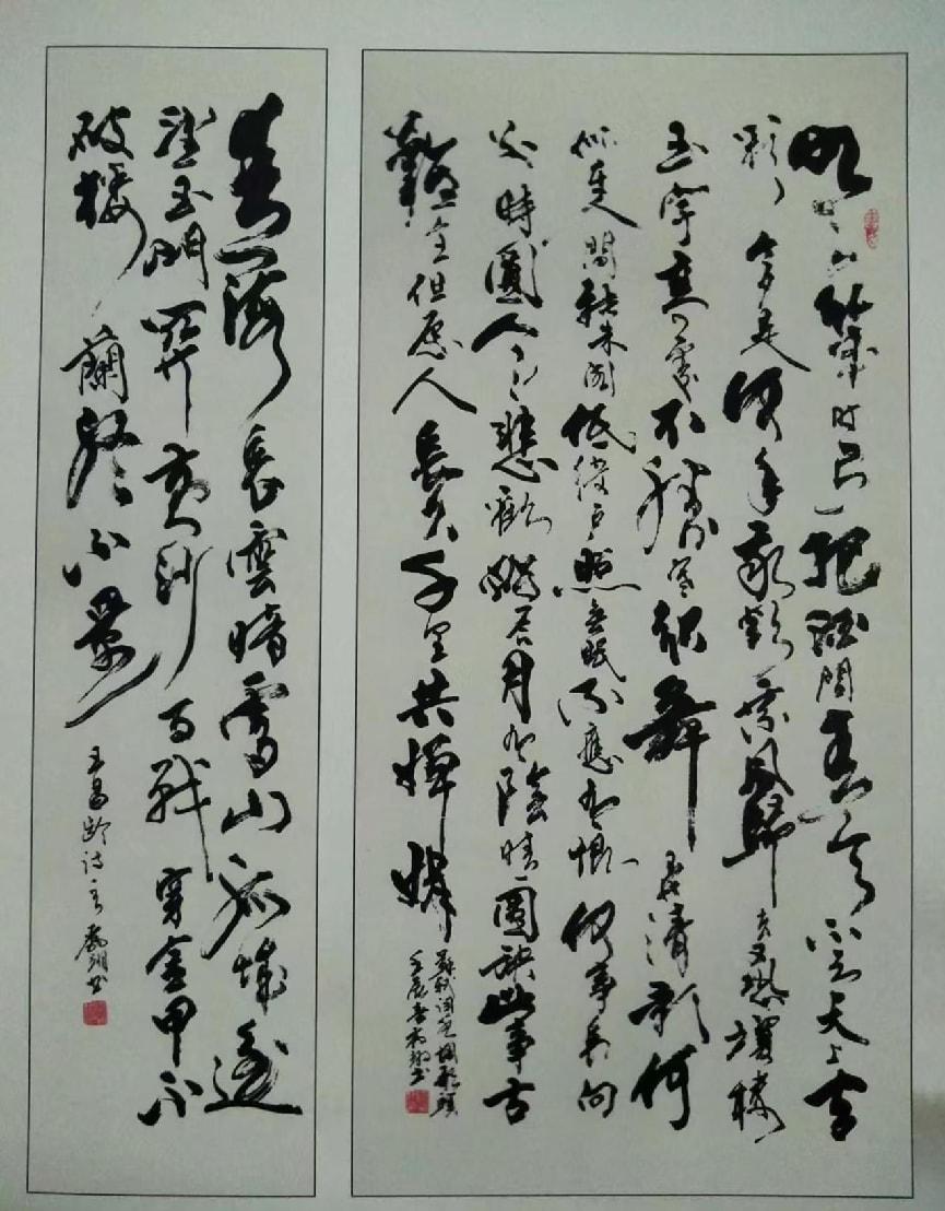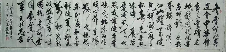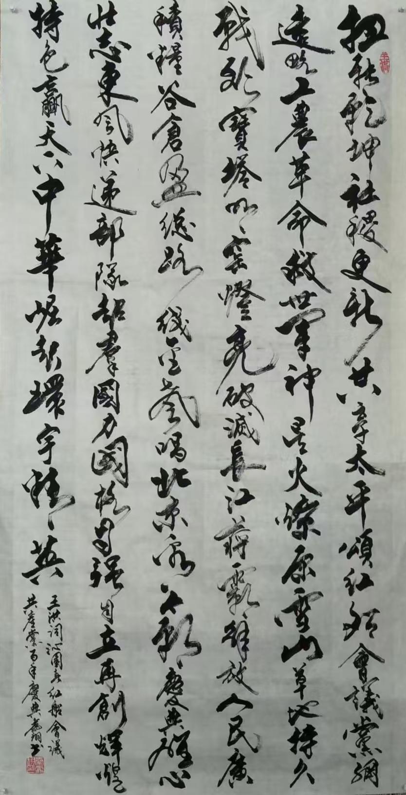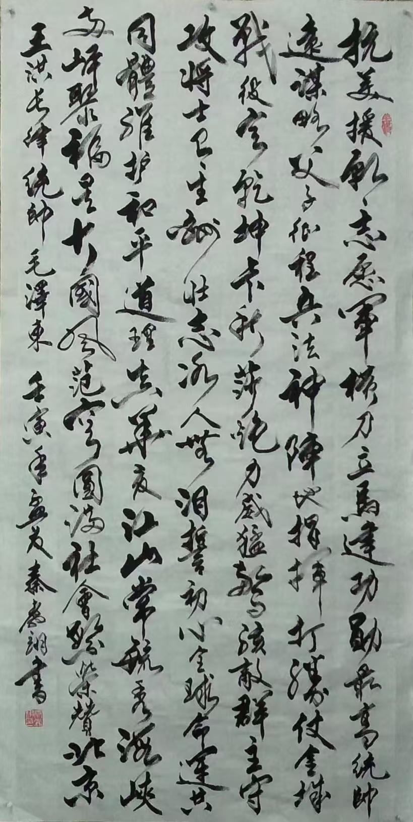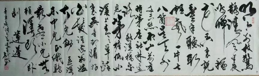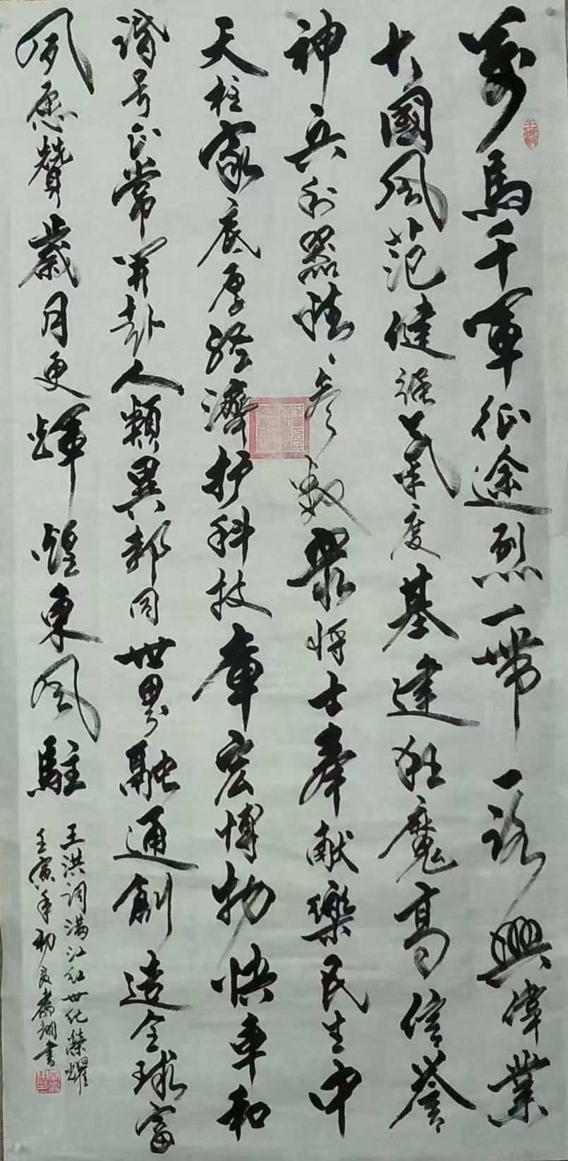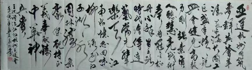 先生尤精于行草。他的行书,取法二王的飘逸秀美,却又融入了颜鲁公的浑厚筋骨,于流畅飞动中见沉稳,不浮不滑,字里行间透出一股文人的清刚之气。而他的草书,则更见性情。时而如狂风骤雨,笔走龙蛇,满纸云烟,情感奔泻如江河决堤;时而又如溪流潺湲,牵丝引带,缠绵萦回,于疏密虚实之间,营造出无尽的意境。他常说:“书法非技,乃心画也。点画之间,皆是修行,映照的是书者当下的心境与品格。” 故而他的每一幅作品,都不仅仅是技艺的展示,更是一次内心的独白与生命的律动。