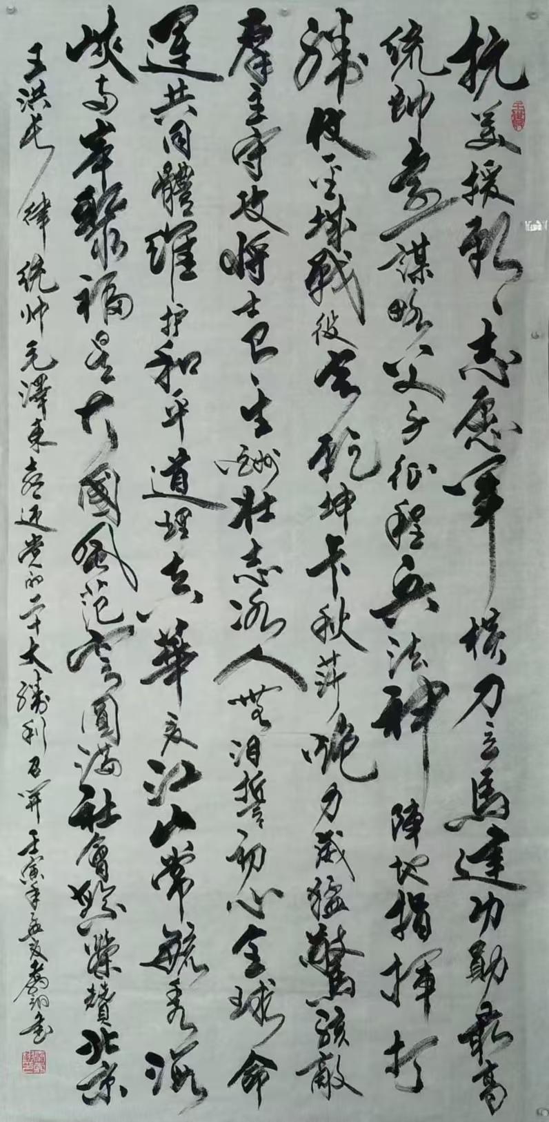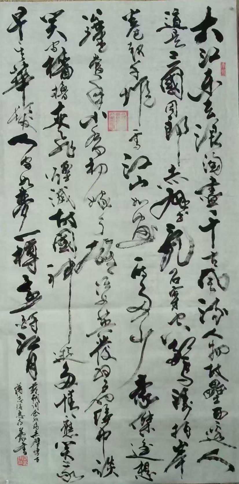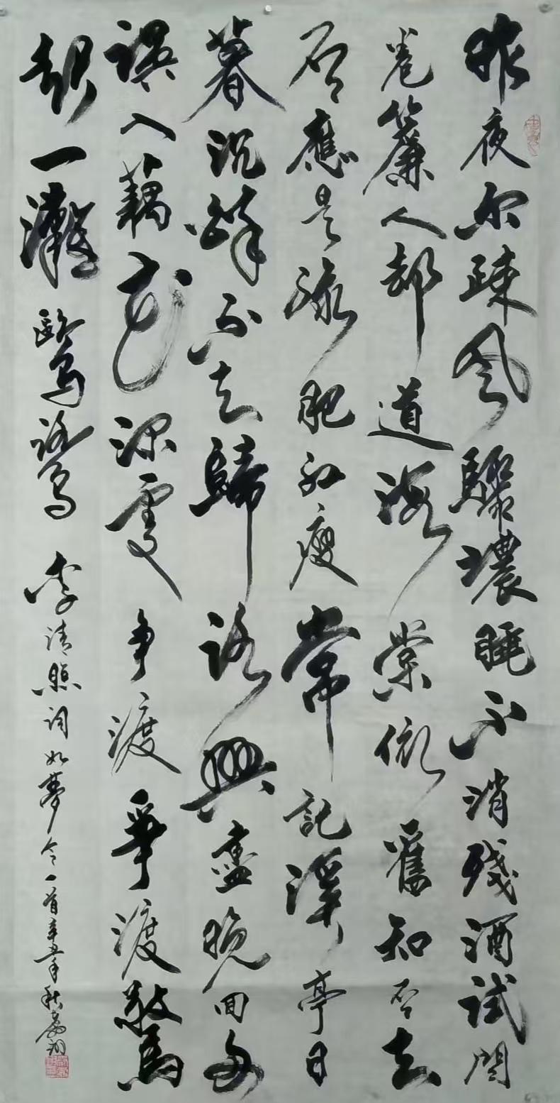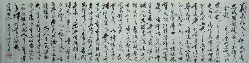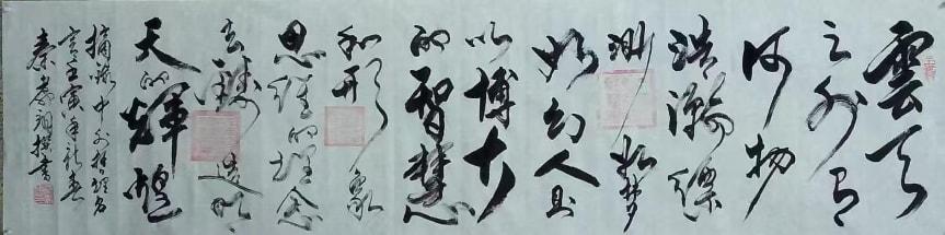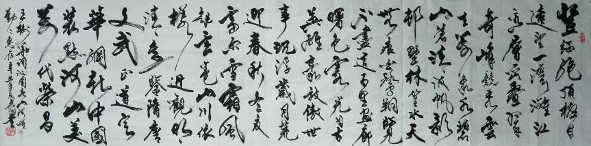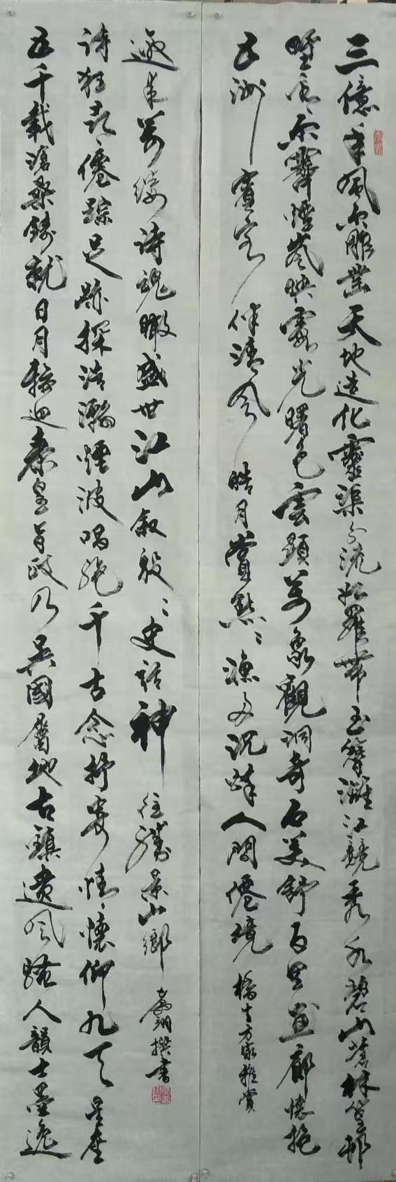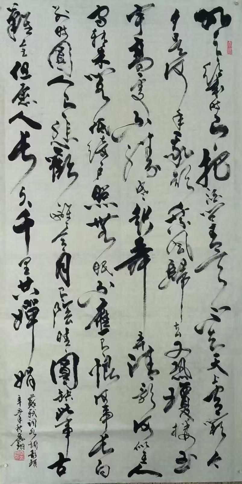 先生尤精于行草。他的行书,取法二王的飘逸秀美,却又融入了颜鲁公的浑厚筋骨,于流畅飞动中见沉稳,不浮不滑,字里行间透出一股文人的清刚之气。而他的草书,则更见性情。时而如狂风骤雨,笔走龙蛇,满纸云烟,情感奔泻如江河决堤;时而又如溪流潺湲,牵丝引带,缠绵萦回,于疏密虚实之间,营造出无尽的意境。他常说:“书法非技,乃心画也。点画之间,皆是修行,映照的是书者当下的心境与品格。” 故而他的每一幅作品,都不仅仅是技艺的展示,更是一次内心的独白与生命的律动。