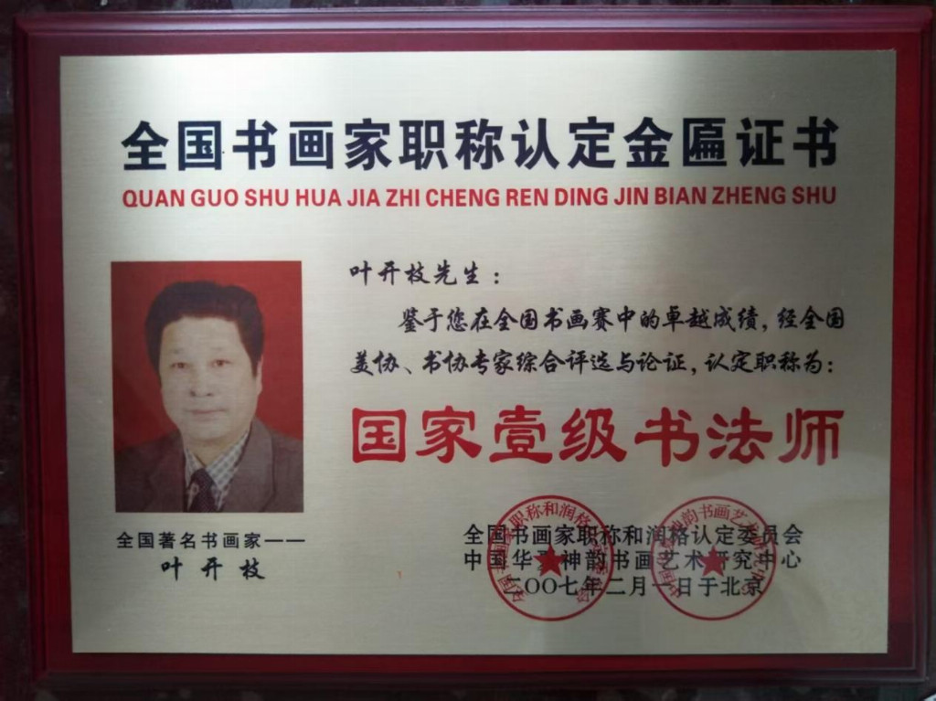 画家协会理事研究员、中国书法家协会会员、中央国家机关书法家协会会员、中国书画家联谊会会员、香港中国书法家协会会员、理事、副秘书长、香港书法院名誉院长、安徽省书协会员、中国书画家联谊会新文艺群体书画家工作委员会会员副秘书长、中华诗词学会会员、全球汉诗总会会员。中国毛泽东诗词研究会会员、中国楹联学会会员、中国收藏家协会会员、英国皇家艺术研究院荣誉院士、客座教授、瑞典皇家艺术学院荣誉博士、法国皇家艺术学院特聘为“外籍名誉院长”,特评定叶开枝先生荣获“全球艺术投资巅峰奖”,并于“全球最具投资价值与收藏潜力艺术家”荣誉称号及“艺术及文学荣誉勋章”以及“全球十大巅峰艺术家’称号。