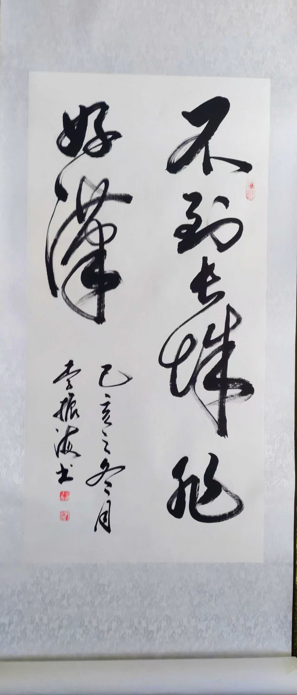 他的书法更是如此。写“海”字时,左边三点水各具姿态,右边“每”部收放自如,整个字仿佛有了呼吸。最妙的是末笔那轻轻一顿,不张扬,却让整个字稳稳立在纸上,如舟泊岸,从容自若。这让我想起他曾说的:“做人如写字,要在收放之间找到平衡。”