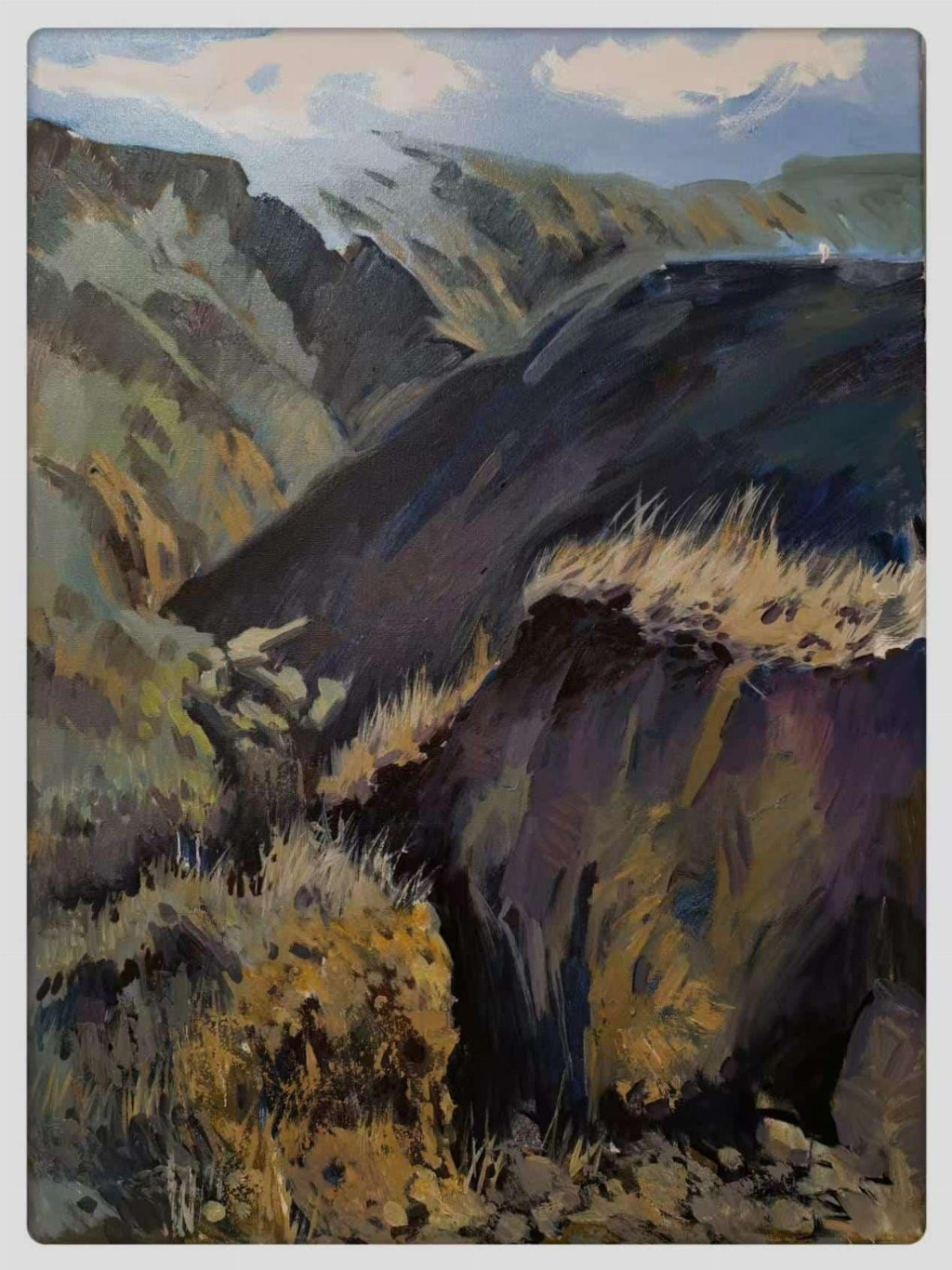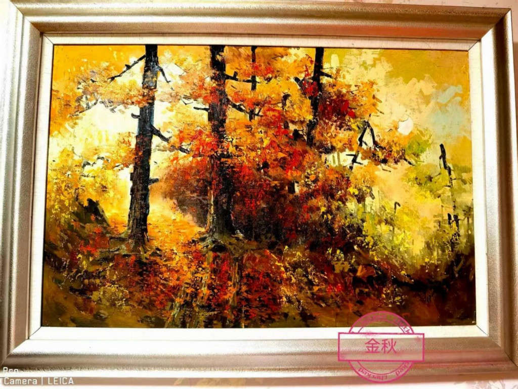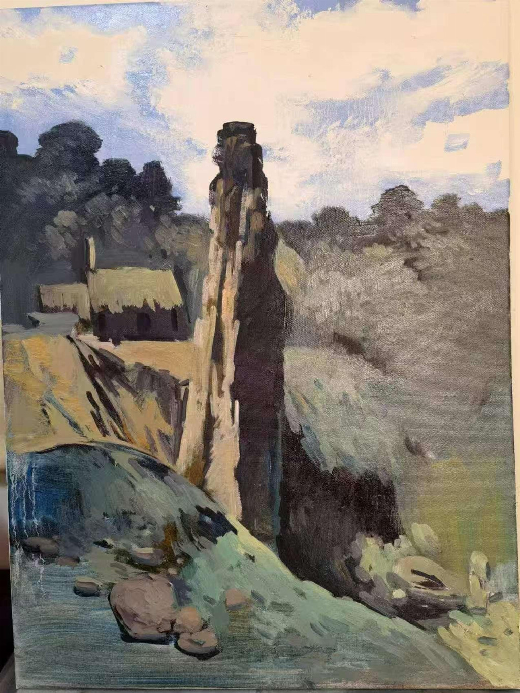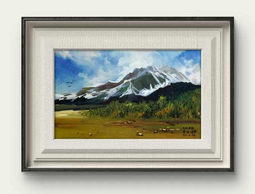 郭银峰先生的油画最引人入胜之处,在于他成功地将中国画的“写意精神”灌注于西方油画的载体之中。他并未拘泥于西方古典油画的严谨透视与细腻描摹,而是大胆地汲取了中国传统书画的养分。在他的笔下,油彩拥有了水墨般的淋漓与气韵;画面的构图,讲究“疏可走马,密不透风”的节奏感;色彩的铺陈,则追求“随类赋彩”而又“气韵生动”的东方美学境界。
