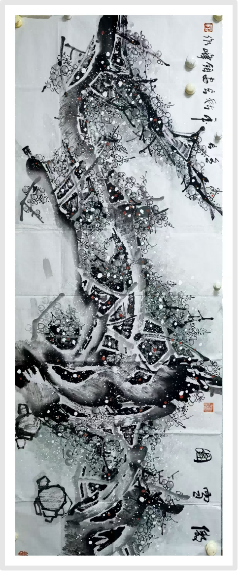 他的笔下,既有“致广大”的磅礴气象,亦有“尽精微”的幽深意蕴。丈尺巨幛,墨海翻腾,山河在他腕底不是自然的复刻,而是人格的扩张与宇宙精神的写照,充满了撼人心魄的生命张力;而尺素小品,逸笔草草,一花一木皆蕴含无限机趣,透露出其与万物共鸣的灵心。他的线条,是情感的轨迹,是思想的舞蹈,时而如金刚杵般凝重坚实,时而如行云流水般畅达自如,早已超越了技艺的层面,升华为一种独立的审美客体与精神符号。