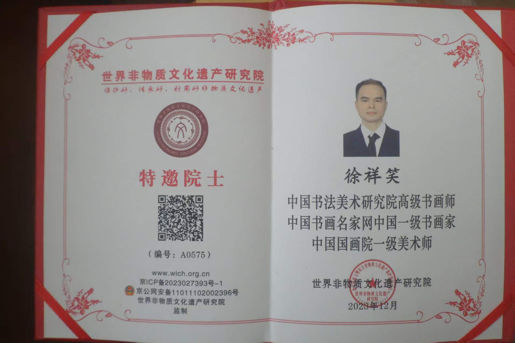 徐祥笑,原名徐笑,男,汉族,1976年11月出生,广西桂平人,高中毕业,十二岁起在桂平市文化馆美术学习班学习素描水粉、油画等基础训练。经过多年的刻苦专研,并得到收藏家,书画鉴定家黎展华老师的精心指教,为此起了“天一竹"的斋名激发我艺术潜能,做最好的自己,寄托能成为画坛上一枝独特的长青竹。现为广西桂平市美术家协会会员;央广文旅国际合作发展中心副理事长、中国书画名家网中国一级书画家、签约书画名家、荣誉理事终身;中国国画院一级美术师;中国文人美术家协会理事;中国文人书法家协会理事;中国书画研究院艺术委员会委员;中国水墨莲花书画艺术网会员;北京华夏博学国际文化交流中心会员;北京世纪百家国际文化发展中心研究员;中国书法美术研究院高级书画师;世界非物质文化遗产研究院院士;香港中国书法家协会理事;亚洲国际青年电影节评审团主席;中国东方文化研究会艺术专业人才数据库;2025年担任中央新影中学生频道艺术之旅专家评委等。