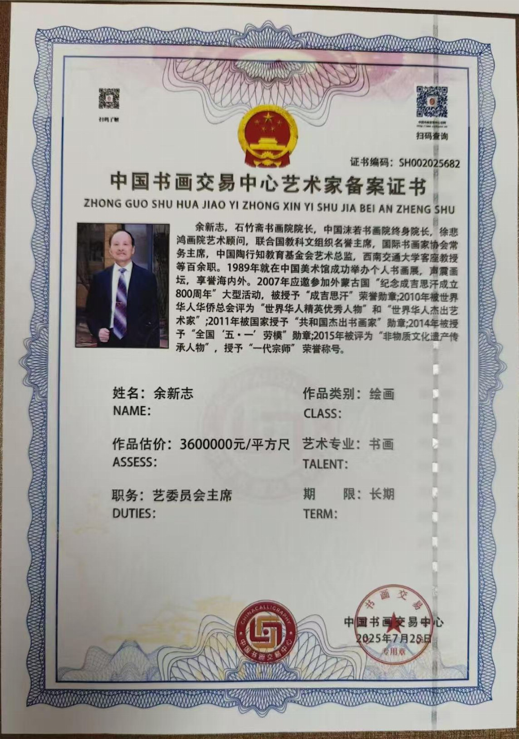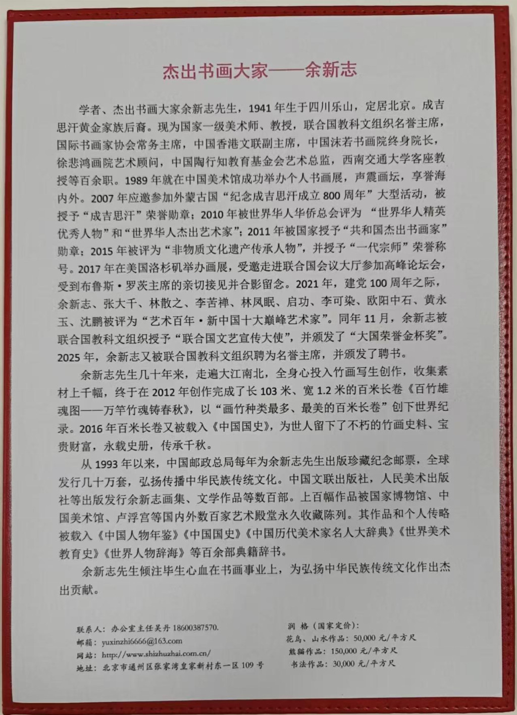 1989 年余老师就在中国美术馆成功举办个人书画展,声震画坛, 享誉海内外。2007 年应邀参加外蒙古国“纪念成吉思汗成 立 800 周年”大型活动,被授予“成吉思汗”荣誉勋章;2010 年被世界华人华侨总会评为“世界华人精英优秀人物”和“世 界华人杰出艺术家”;2011 年被国家授予“共和国杰出书画 家”勋章;2014 年被授予“全国‘五·一’劳模”勋章;2015 年被评为“非物质文化遗产传承人物”,授予“一代宗师” 荣誉称号。2017 年在美国洛杉矶举办画展,受邀走进联合 国会议大厅参加高峰论坛会,受到布鲁斯·罗茨主席的亲切 接并合影留念。2021 年余新志先生与张大千、林散之、李 苦禅、林凤眠、启功、李可染、欧阳中石、黄永玉、沈鹏等 顶尖级艺术家被评为“艺术百年·新中国十大巅峰艺术家”。 余老先生几十年来,走遍大江南北,全身心投入竹画写生创 作,收集素材数千幅,终于在 2012 年创作完成了长 103 米、宽 1.2 米的百米长卷《百竹雄魂图——万竿竹魂铸春 秋》,创下“画竹种类最多、最美的百米长卷”世界纪录, 传承千秋。2016 年百米长卷又被载入《中国国史》,为世 人留下了不朽的竹画史料、宝贵财富,永载史册。2024 年经国家艺术档案馆严格审评授予余新志为《中国四大国粹传 承人》,并颁发荣誉证书。2024 年 7 月授予《中国书画百 年巨匠传人》颁发荣誉锦旗、荣誉证书。从 1993 年以来, 中国邮政总局先后为余新志先生出版珍藏纪念邮票三十余 套,全球发行,传播文化。并先后出版发行余新志个人专著 画集数百套。上百幅作品被国家博物馆、中国美术馆等国内 外几百家艺术藏馆永久收藏陈列。其个人传略被载入《中国 人物年鉴》《中国国史》《中国历代美术家名人大辞典》《世 界人物辞海》等百余部辞书。余新志先生倾尽毕生心血,为 弘扬中华民族优秀的传统文化作出了杰出贡献。