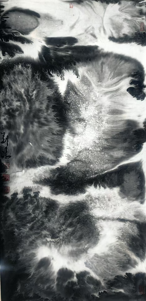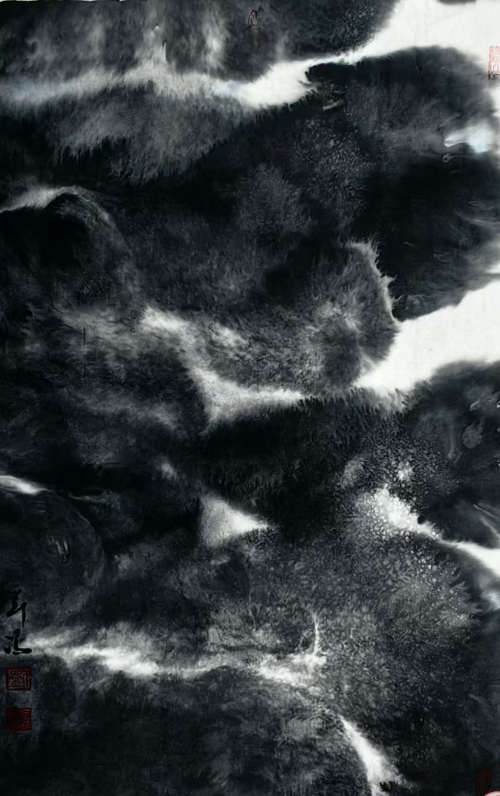 宏观刘冯先生之作,画中山水从不施以彩色,更不媚以矫饰,而是独以水墨气象挥毫妙意,笔墨浸染,山水一体,浓墨之处可见万壑松云之浩然,淡墨之处则又可见云水飘荡之幽谧!臂如画中飞瀑,乃依山势而奔腾弥漫,皴擦其质感,点染其动态,是谓粗狂中不失严谨,淋漓中不失真意,欣赏之余,似有水雾扑面而来!而如此激荡自然的水韵气象,也恰恰就是能从侧面充分反映出刘冯先生对于水墨的高度写意掌控,刹那之间,可感旷达,细品之余,更见畅神!