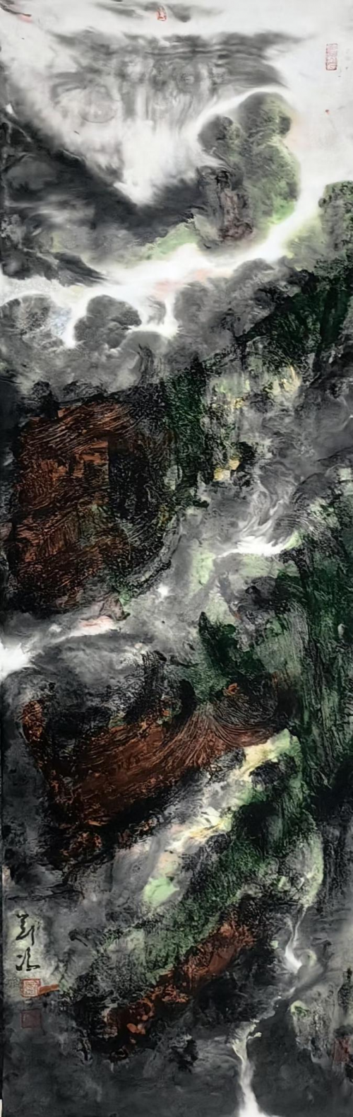 外师造化,中得心源,这是传统山水画家的取法正道,今日的刘冯先生亦是如此,但和大部分画家所不同的是,刘冯先生的山水意象则是能在基础上树立于更加独特的自我新意!而这种新意的形成,既可以说是源自于刘冯先生对于传统水墨的禅意思考,同时也更可以说是他那感性内涵和理性笔墨的交织成果!欣赏之余,即可使人不由得陶醉于其间,栝静感受超凡脱俗,缥缈浩然心驰向往,标新立意,与众不同!