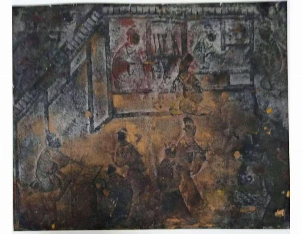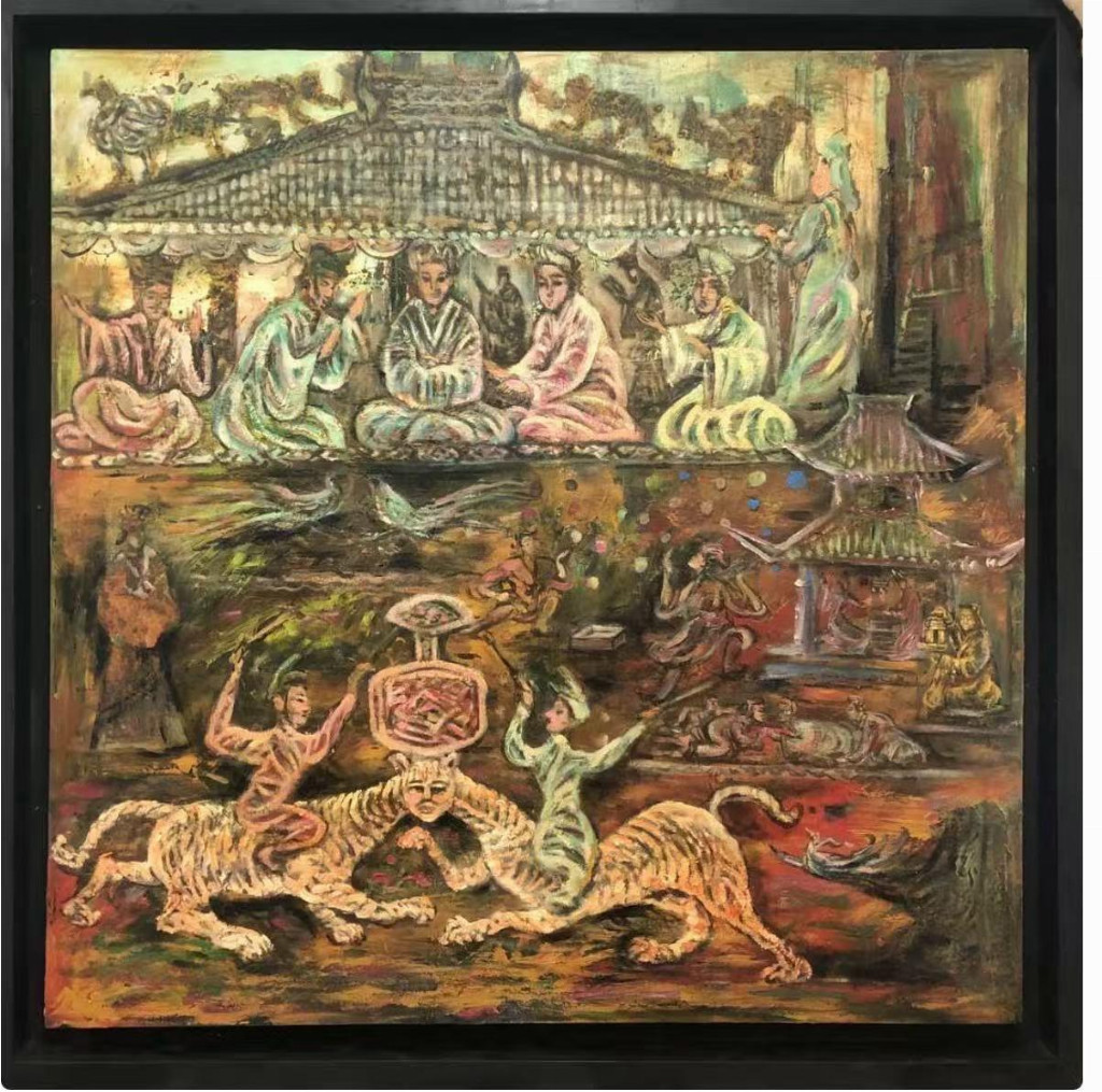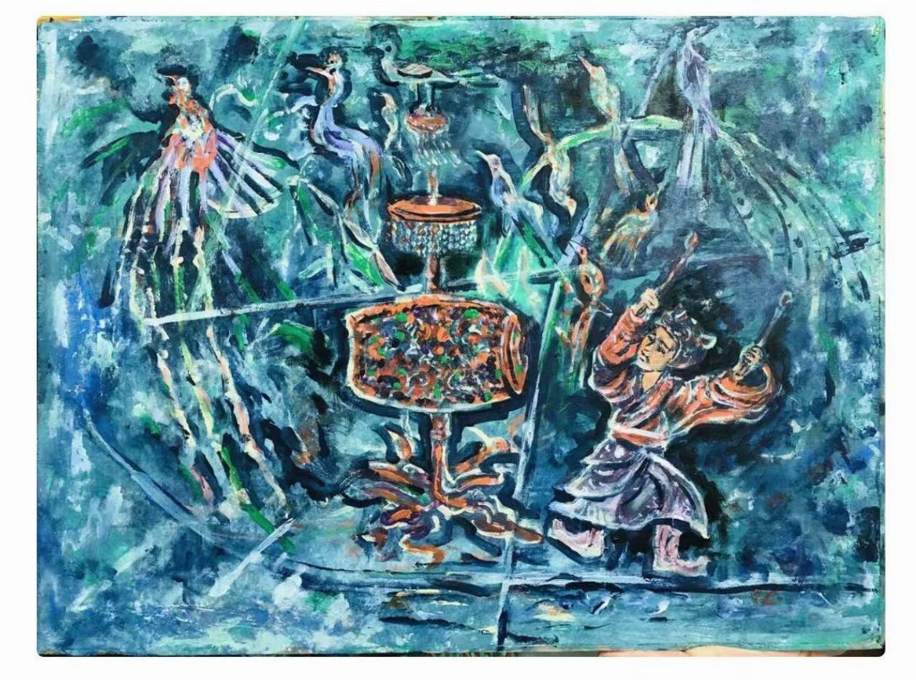 中国汉画百圆油画精品《击鼓戏鸟图》