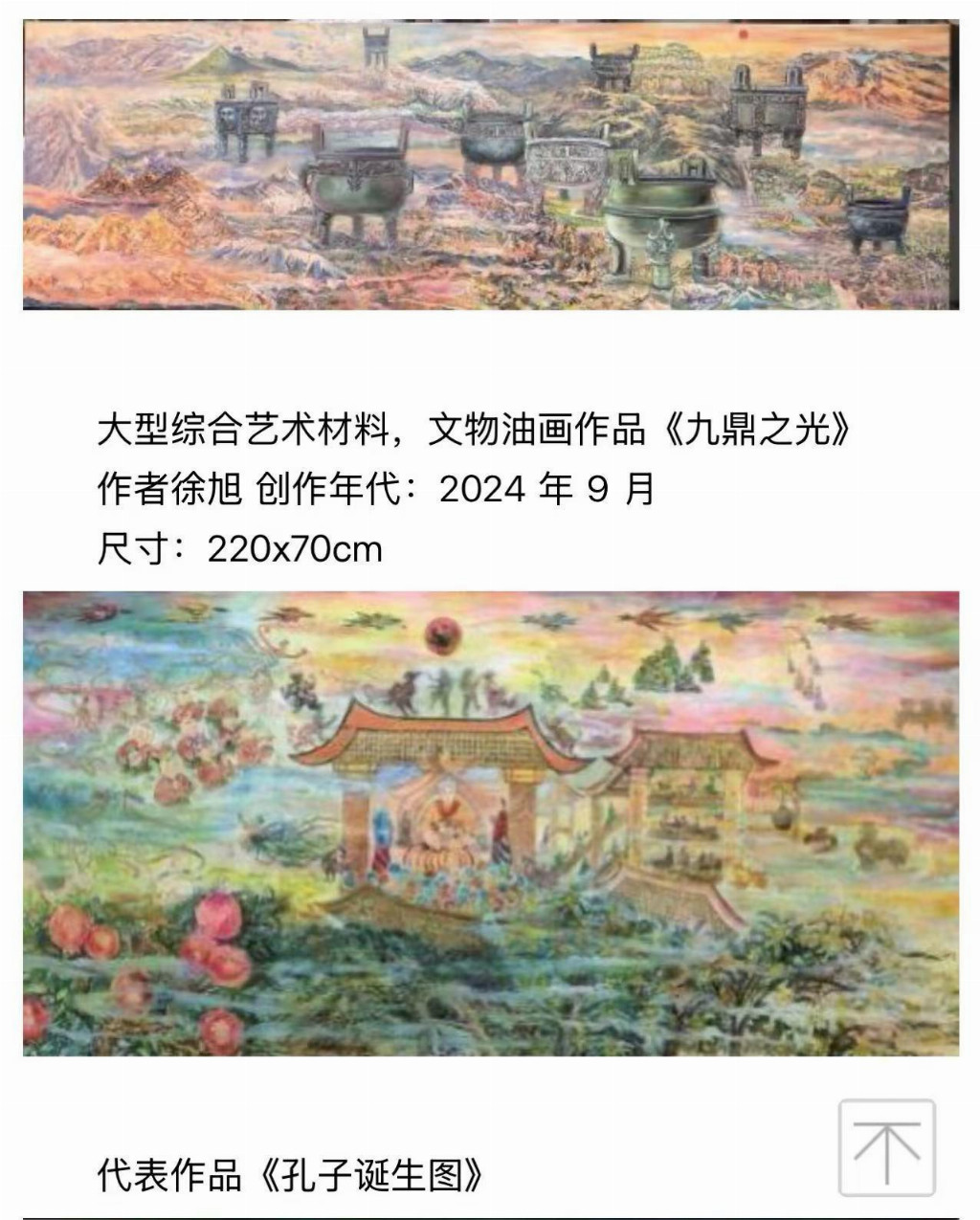 徐旭浙江省绍兴诸暨人。中央美术学院油画系首届材料艺术研究生课程班毕业。江苏省师范大学历史系文博专业毕业。中国华东六省一市首届美术考古绘图训练班结业。现为国家一级美术师。国家一级书法师。人民书画报理事会主席任期(2023 一2026)。全国人民艺术家信用管理中心书画艺术委员主席(长期)。中国书画研究会、文化艺术委员会《艺术顾问》。浙江省诸暨市油画学会名誉主席。北京大学教授。中国艺术研究院研究生院博士生导师。中央美术学院客座教授。清华大学美术学院客座教授。中国汉画艺术发展研究院终身院长。中国汉画儒道艺术研究院终身院长。中国美术考古研究所终身所长。故宫博物院研究员。大型中国历史文物油画《九鼎之光》荣获中央美术学院第六届社会美育国际艺术节特等奖。