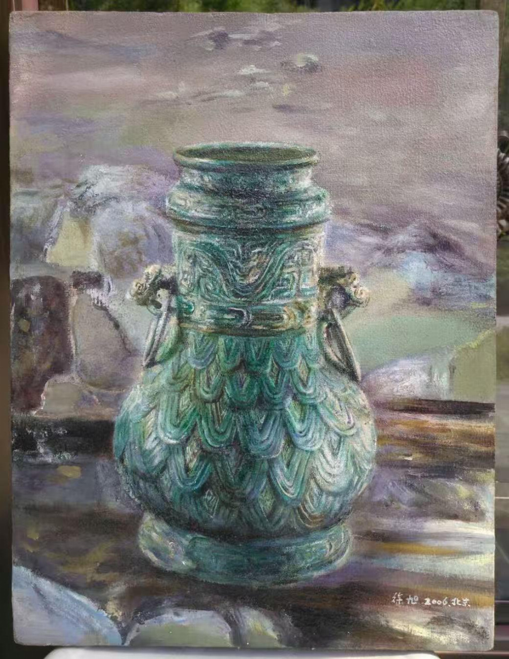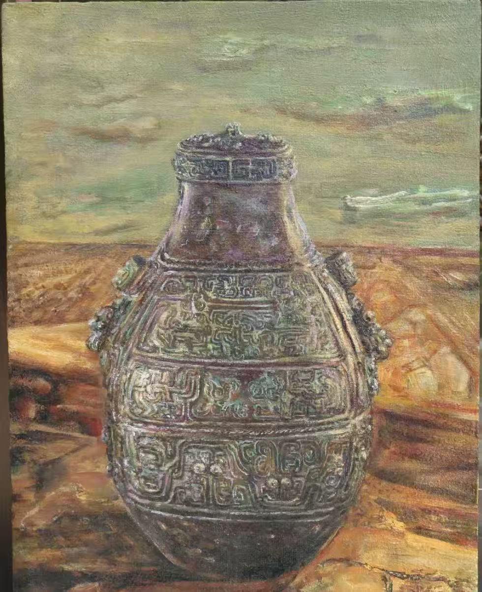 中国青铜100号文物油画作品《商周青铜双耳壶》