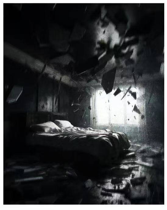 作品《一生的潮湿》中,陈采薇巧妙地运用AI数字技术,将摄影与手绘元素完美融合,使得作品中的墙面裂纹、飘浮的碎屑与受阻的光线共同营造出一种濒临瓦解的视觉结构,将普通的卧室空间重构为一个充满情感张力的场域。作品中的“潮湿”不仅是对物理环境特征的描绘,更是对情感记忆的具象化表达——那些未曾消解的情绪、沉淀的往事以及封存的生命痕迹,在时空维度中不断酝酿。正如陈采薇在创作中所言:“潮湿在此象征着时间的滞留与情绪的沉积:那些未曾挥发的思绪、压抑的回声、无法风干的生活痕迹,都在空气中缓缓发酵。”