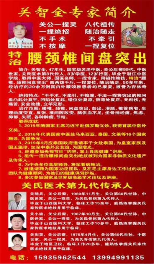 “腰椎间盘突出有法治愈”,“关公一捏灵”关智全“一捏复位”专治“腰椎、颈椎间盘突出”。“专治腰椎颈椎间盘突出”:由中医大师,国医名师,一捏专家,关氏骨伤第八代传人,国家非遗传承人,关智全专家坐诊北京善妙堂,关氏祖传绝技治疗颈椎、腰椎间盘突出机理,脊柱结构:及椎间盘的作用,人体共有33个椎体,23个椎间盘,椎间盘的作用:连接上下两个椎体,稳定关节,起到承上启下作用。缓解机体冲击力。椎间盘是由纤纹环,髓核构成的胶原软组织构成,富有弹性的软骨垫。在正常情况下,保持机体稳定的生理功能。我们中医多采用保守治疗,用祖传绝技手法,不手术,不牵引,不按摩,四两拨千斤,对突出的病灶,手摸心会,外揉展筋丹,使局部粘连的组织缓解,经络通畅,再用家传手法,轻巧抚摸,瞬间剪力对挤,一捏复位,将凸起处抚平,凹陷处扶起错位处复原,侧弯处扶正,达到阴平阳密,精神乃治,阴阳平衡,经络通畅,气血协调恢复正常。此法无痛苦、无风险,病人在毫无痛苦的情况下,瞬间一捍复位,当听到咯噔一声响时,即可解除疼痛,手法轻巧,简便效捷,无痛苦随治随走,无需住院,再配合机体功能锻炼,即可康复,费用小,无风险,无创伤。