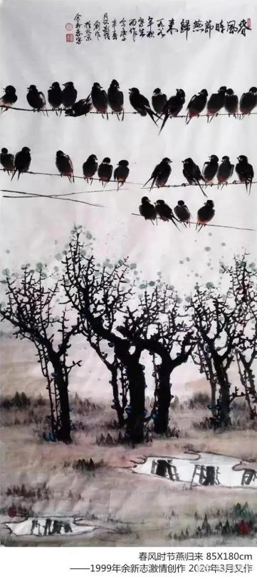 余新志先生的绘画题材广泛 ,尤以花鸟、 山水见长。在花鸟画创作中, 他笔下的禽鸟灵动鲜活,仿佛下一秒就要振翅高飞。他善于捕捉禽鸟的 瞬间神态,通过细腻的笔触和丰富的色彩,将禽鸟的羽毛质感、眼神灵 动都刻画得入木三分。如他笔下的雄鹰 , 目光犀利,羽翼丰满,展现出 一种傲视苍穹的霸气;而那枝头的雀鸟,则小巧玲珑 ,叽叽喳喳,充满 了生活的情趣。